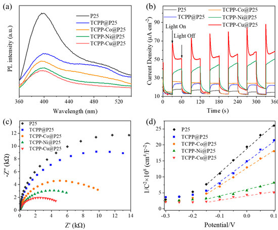 It is well known that the charge carrier separation plays an important role in the photocatalytic reaction [18]. As shown in Figure 2a, the PL intensity decreased after loading with TCPP or TCPP-M, which could be attributed to improved charge separation efficiency [22]. Moreover, transient photocurrent (TPC) response and electrochemical impedance spectroscopy (EIS) were also studied. Figure 2b shows that TCPP-Cu@P25 exhibited the highest photocurrent density, followed by TCPP-Ni@P25, both of which were much higher than TCPP@P25 or pure P25. However, the photocurrent response of TCPP-Co@P25 was very close to that of TCPP@P25. The EIS graph (Figure 2c) shows the smaller semicircle diameters of TCPP-M@P25 (M = Co, Ni, Cu) in comparison with TCPP@P25 and pure P25, indicating enhanced charge transfer efficiency after the conjugation of metalloporphyrins [36]. The charge transfer process was also studied by Mott–Schottky (M–S) curves analysis (Figure 2d). All the samples showed a positive slope in the M–S plots, as expected for an n-type semiconductor. The TCPP-Cu@P25 showed the smallest slopes on the M–S plot, compared to TCPP-Ni@P25, TCPP-Co@P25 and TCPP@P25, confirming that the introduction of metalloporphyrin led to faster charge transfer, especially for the TCPP-Cu@P25. The above results verify that the metalloporphyrin-based cocatalyst greatly promoted the separation of photogenerated electron-hole pairs, thereby resulting in the dramatically enhanced activity of TCPP-Cu@P25.