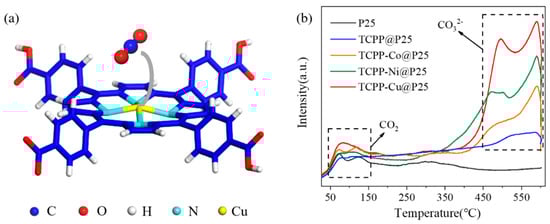 (a) The optimized structure for CO2 adsorption on a TCPP-Cu unit; (b) CO2-TPD spectra of P25, TCPP@P25, TCPP-Co@P25, TCPP-Ni@P25 and TCPP-Cu@P25.