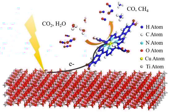 Schematic illustration for photocatalytic CO2 reduction over TCPP-Cu@P25. An anatase TiO2 structure is used to represent P25.