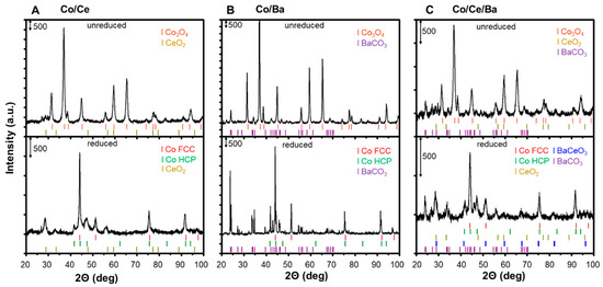 XRPD patterns of the Co/Ce (A), Co/Ba (B) and Co/Ce/Ba (C) samples before and after the reduction; data collected at ambient temperature and at reduction temperature (550 °C), respectively.