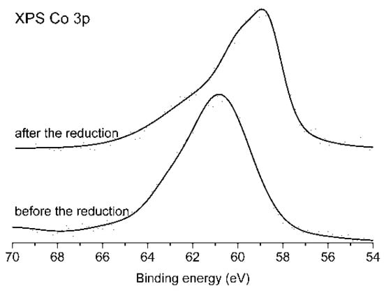 The high-resolution X-ray photoelectron spectra of Co 3p in the Co/Ce/Ba sample before and after the reduction.
