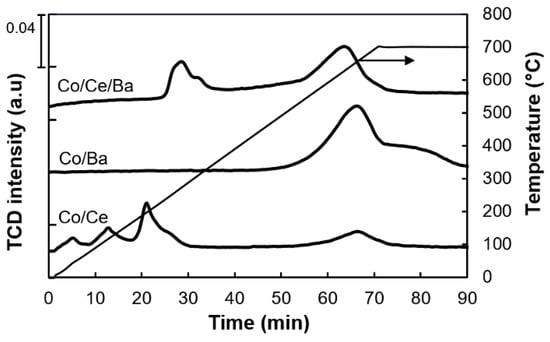Hydrogen desorption profiles for the Co/Ce, Co/Ba and Co/Ce/Ba catalysts.