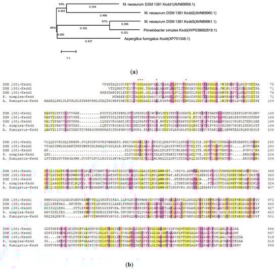 To obtain the nucleotide sequence of KSDD (ksdd1, ksdd2, and ksdd3), the genome of M. neoaurum DSM 1381 was sequenced and annotated. Three putative ksdd ORFs were identified in our previous study []. KSDDA from Aspergillus fumigatus and KSDDP from Pimelobacter simplex were reported to have high dehydrogenation activity on the C1,2 bond of ring A. Five KSDD were amplified, and a phylogenetic tree was subsequently constructed with MEGA X to elucidate the evolutionary relationships (Figure 2a) []. The BLAST result of KSDD1 from M. neoaurum DSM 1381 exhibited a high similarity at the amino acidic level (>95%) to M. neoaurum NwIBL-01, M. neoaurum ATCC 25795 and M. neoaurum VKM Ac-1816D, while the KSDD2 of M. neoaurum DSM 1381 was 85% identical at the amino acidic level to the KstD2 of M. neoaurum ATCC 25795. All five KSDDs from different genera had the putative N-terminal FAD-binding motifs G-SG-(A/G)-(A/G)-(A/G)-X17-E (Figure 2b) [,]. Figure S1 shows that ksdd1 and ksdd2 both have one transmembrane segment near the N-terminal, which suggest they could be membrane proteins, through analysis by TMHMM (http://www.cbs.dtu.dk/services/TMHMM/).