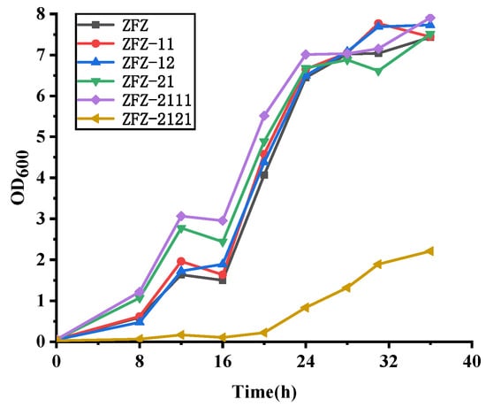 As described in Section 4.2, the recombinant KSDD integration plasmids were constructed and introduced to ZFZ by electroporation to obtain the ADD production strain. The effects of different ksdds on the growth of recombination strains were detected (Figure 3 and Figure S2). The growth curve of almost all recombinant strains was consistent with ZFZ. ZFZ-21, ZFZ-2111 and other recombinant strains have higher OD values than ZFZ, except for ZFZ-2121. This shows that the expression of KSDD has a certain promoting effect on the growth of ZFZ. It is possible that the high KSDD dehydrogenase activity would inhibit the growth of the strain, and that the OD value of ZFZ-2121 containing a tandem Psmyc-ksdd1 cassette would be much lower than ZFZ.