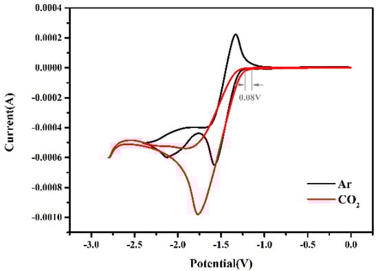 Cyclic voltammogram of o-methylbenzophenone on a glassy carbon (GC) electrode under argon (black trace) or with CO2 bubbling (red trace). The reaction solution consists of supporting electrolyte (0.1 M of Bu4NBr) and o-methylbenzophenone (40.0 mM) in 20 mL of acetonitrile by using Ag/AgBr as the reference electrode and Al as the counter electrode.