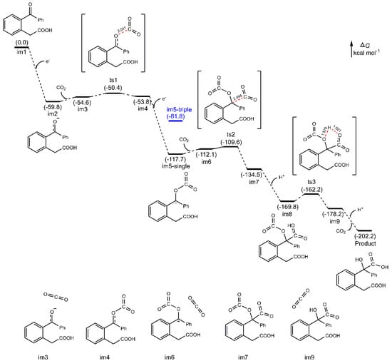 The corresponding density functional theory (DFT) calculation for the electro-carboxylation step in path 1 is conducted to indicate the possible thermodynamics (Figure 2 (for details, please see Supplementary Materials)) [,,,,,,,]. It is noted that the energy barriers for two successive CO2 additions are only 9.4 and 8.1 kcal/mol, respectively. This shows the reaction may proceed smoothly. For the intermediate structure im5, the singlet is much more stable than the triplet with ca. 36 kcal/mol of energy difference, which means the actual reaction should occur at the singlet state.
