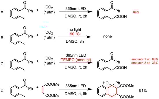 Photo-carboxylation of o-methylbenzophenone with CO2 (A) under standard condition, (B) with heating instead of light, (C) with radical quencher added, and (D) reaction of o-methylbenzophenone with traditional dienophile.