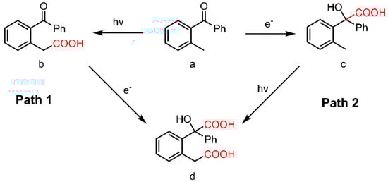 Due to the poor efficiency of synchronous photo- and electro-carboxylation, a one-pot step-by-step dicarboxylation procedure is proposed. That is, the photo-carboxylation and subsequent electro-carboxylation are conducted in one vessel. From the CV analysis (Supplementary Materials Figure S3) of o-acylphenylacetic acid (Scheme 3, compound b), it is noted that its onset potential is at −1.4 V and the reduction peak at −2.2 V, which is ca. 0.5 V more negative than o-methylbenzophenone. That means higher electric energy would be consumed in this electrochemical process. In fact, a constant current of −15 mA/cm2 is necessary during this electro-carboxylation. Considering the performance of solvents in both photo- and electro-carboxylation, DMSO is relatively suitable for this process. Finally, a dicarboxylic acid, 2-(2-(carboxymethyl)-phenyl)-2-hydroxy-2-phenylacetic acid (Scheme 3, compound d), is obtained in this one-pot approach, confirmed by liquid chromatography—mass spectrometry (LC-MS) analysis.