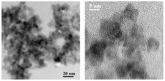 Morphological characterization of the plasma reduced DNDs, was performed by transmission electron microscopy (TEM) analysis (Figure 1). The investigation revealed that DNDs are agglutinated in the form of aggregates of several tens of nm, making the study of single particles difficult. Nevertheless, the particles maintain their individuality, so that, by using two different approaches (by taking pictures at different focus values and by the inverse Fourier transform of the HREM pictures diffractogram with one reflection at a time), we were able to measure a remarkable uniformity of the particle size between 5 and 10 nm.
