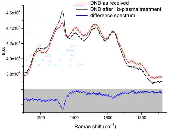 In order to better compare the spectra of treated and untreated sample DNDs, the difference spectrum is reported (as the blue line in Figure 2). The main differences are detected at approximately 1330 cm−1, 1640 cm−1 and 1750 cm−1, indicating that the treatment is effective in reducing sp2 phase. The fact that the shoulder signals at approximately 1750 cm−1, could be related to the C=O bonds located on the DNDs surface. The decreasing of these bands for the treated DNDs, could indicate a reduction of this oxygenated functional group on the DND surface, after the plasma treatment [29].