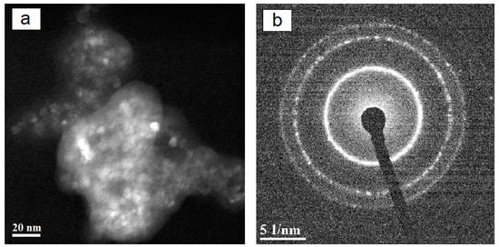 The analysis of the morphology of the functionalized DNDs, was performed by a local analysis at the nanoscale, by means of the HAADF-STEM technique. Under proper conditions, the contrast intensity of the images is highly sensitive to variations of the atomic number of the elements in the sample under investigation. In Figure 4a, a typical high-angle annular dark field (HAADF) image of the sample is reported, and we can observe the sample appear as approximately 200 nm sized aggregates, given by a high density of homogenously distributed DNDs particles. Figure 4b reports the electron diffraction pattern of the same aggregate, showing the peculiar diffraction signals of the polycrystalline diamond. Specifically, the rings relating to reflections from the (111) (d = 0.206 nm), (220) (d = 0.126 nm) and (311) (d = 0.107 nm) planes, are evident in the picture.