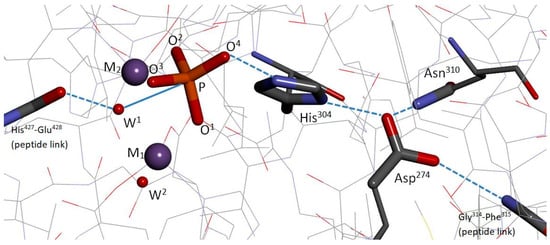 Co-crystal structures of PP5/phosphate [13], PP1/tungstate [14], and PP1/phosphate [15], reveal common PPP catalytic-site features, including: A bimetal system held in place by the same amino-acid scaffold of six residues, a bridge hydroxide/water (W1), a metal-bound phosphate (or tungstate) positioned by the same four residues, and a cooperative histidine/aspartate tandem. As shown for PP5/phosphate, Figure 1, the alignment of the phosphate with W1 strongly implies a nucleophilic attack on the P center by W1, with subsequent protonation of the exiting alkoxide at the O4 site by H+ transfer from Nϵ of His304. Furthermore, Swingle et al. argued that W1 is a hydroxide ion, and that the exiting alkoxide oxygen is probably not metal bound [13]. Of course, this inferred mechanistic scenario depends on a match between the phosphate ion’s binding mode seen in the PP5 co-crystal and the binding mode of the phosphoserine/phosphothreonine substrate, which is unknown. Notably, the co-crystals also reveal a second water/hydroxide (W2) coordinated to M1, a backbone carbonyl (PP5:His427) positioned to direct W1, and a backbone -NH group (PP5:Phe315) anchoring the His/Asp tandem at the backend, Figure 1. In PP5, Asp274 is also anchored by the nonconserved Asn310 (likewise in PP1 and PP7, threonine otherwise). Thus, these co-crystals, along with mutation studies [16,17] and analysis, established a plausible pathway for PPP dephosphorylation [13,14,15]. The substrate’s anticipated mode of binding to M1/M2 and the W1(OH−) attack on the P center were later corroborated by density functional theory (DFT) calculations by Ribeiro et al. on a cluster model of PP5/phosphoserine [18].