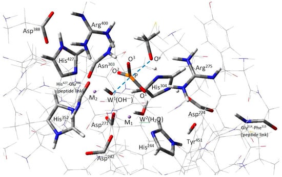 First, our model was built from pdb entry 4ZX2 [20] (PP5 catalytic domain, 1.23 Å res.) by removal of the inhibitor (a modified norcantharidin) and by selection of proximal residues of the catalytic site. Second, we applied aldehyde (–CHO) and neutral amine (–NH2) terminations where we had broken the enzyme’s peptide backbone. Third, hydrogen atoms were added, including one for protonation of His304. After placement of the methylphosphate dianion, the bridge hydroxide (W1), and a water of hydration (W2), the added species and all hydrogens were coarsely optimized using the PM7 semi-empirical method as implemented in Gaussian16 [24]. Finally, we selected the atoms of the “high-level” region of our hybrid computational system, as indicated in Figure 2, and carried out ONIOM(UB3LYP/6-31G(d):UPM7) [25,26,27,28,29,30] partial optimizations. (Of course, depending upon the nature of each computational test, we inserted other waters and removed the hydroxide, the His304 proton, or substrate, as appropriate.) The system, as shown in Figure 2, has zero total charge. During optimizations, the following residues were allowed to move: His304, Asp274, Arg275, Tyr451, and Asn303, as were any added species. The first two residues are the His/Asp tandem. The second two, Arg275 and Tyr451, are known to freely move to accommodate ligand binding and were adjusted to approximate their PP5/phosphate co-crystal positions. The last, Asn303, coordinates M2 and the substrate’s phosphoryl group at O2. All calculations were carried out using the Gaussian16 suite of programs [24].