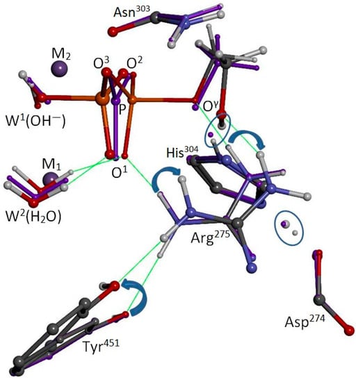 Crystal structure superposition shows that, in the modeling of Ribeiro et al. [18], Arg275 took a position that is partially occupied by Tyr451 in the enzyme. This nonnative reorientation occurred because of the absence of Tyr451 in their model, and it permitted the transfer of H+ from Arg275 to W2(OH−). In the enzyme, Tyr451 blocks Arg275 from contact with W2 when a phosphate-bearing substrate is also ligated to the M1/M2 system. Also, the aforementioned reorientation of Asp274 did not occur in our model because we included Asn310 and the -NH peptide moiety needed to anchor Asp274 (see Figure 1); we froze Arg400, but the presence of Asp388 in our model (see Figure 2) would have prevented an unrealistic reorientation for Arg400 as well. Future improvements to our computational model would allow Arg400 and the M1/M2 system to move because of their direct contacts with the substrate, TS, and product phosphate ion. Only subtle changes would be expected, and the states, as shown in Figure 3, should remain qualitatively the same, but the reaction energetics might be impacted. Regarding movement of the M1/M2 system, an increase of about 0.12 Å in the M1…M2 separation distance did occur for pathways (I) and (II), upon going from reactant to the transition state(s) [18].
