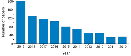 The interest in the field could be highlighted by the exponential increase in the number of papers in this research field. More than 850 papers were published in the last decade in the field of carbonaceous nanomaterials for sensors (Web of Science—Clarivate Analytics, TS = carbon AND nanomaterial AND sensor, May 6, 2020) (Figure 1).