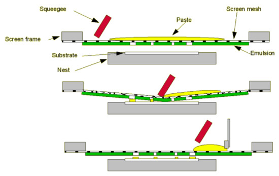 Basic process of screen-printing technology. Reprinted from [51] with permission of Gwent Group, Sun Chemical Advanced Materials, Sun Chemical, United Kingdom. http://www.gwent.org/gem_screen_printing.html.