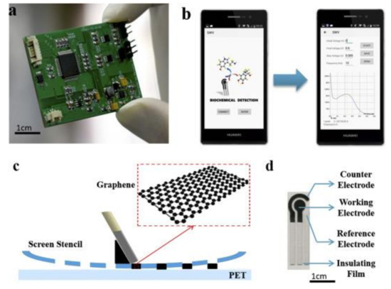 The images of (a) detector; (b) software interface; (c) scheme of screen-printing process, (d) image of SPE. Reprinted from [138] with permission of Elsevier.