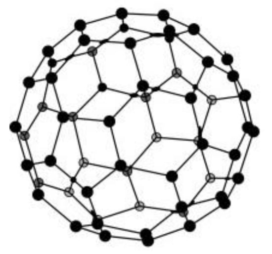 The main representative of this class is fullerene C60 containing 60 carbons arranged in an icosahedric structure [139]. An icosahedron consists of a polyhedron with 12 pentagonal sides and 20 hexagonal sides; its structure is very similar to a modern football, whose design was inspired by Fuller’s geodesic dome. C60 is the smallest stable fullerene (with non-adjacent pentagonal and alternatively hexagonal sides). Figure 5 presents the schematic soccer-ball structure of fullerene.
