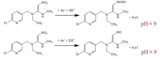 As can be seen, when the pH was < 9, the nitro group of nitenpyram was reduced to the hydroxylamine group accepting 4H+and 4e−. When the pH was > than 9, the nitro group was reduced to the nitroso group accepting 2H+and 4e−.