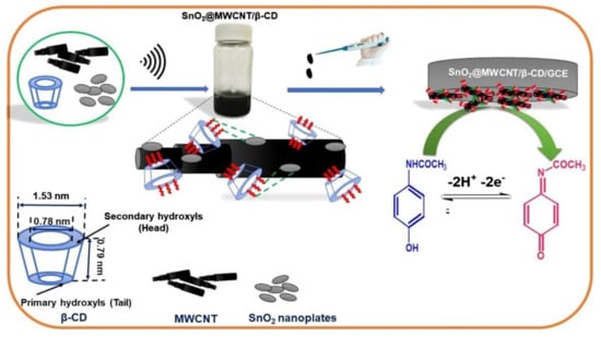 - Devi, R.K.; Muthusankar, G.; Gopu, G.; Berchmans, L.J. A simple self-assembly fabrication of tin oxide nanoplates on multiwall carbon nanotubes for selective and sensitive electrochemical determination of antipyretic drug. Colloids Surf. A Physicochem. Eng. Asp. 2020, 598, 124825. [Google Scholar] [CrossRef]