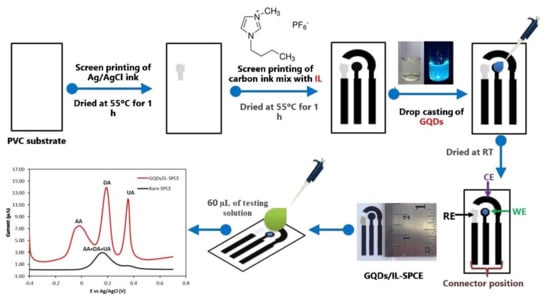 - Kunpatee, K.; Traipop, S.; Chailapakul, O.; Chuanuwatanakul, S. Simultaneous determination of ascorbic acid; dopamine; and uric acid using graphene quantum dots/ionic liquid modified screen-printed carbon electrode. Sens. Actuators B Chem. 2020, 314, 128059. [Google Scholar] [CrossRef]