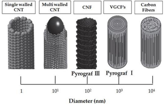 Carbon nanotubes (CNTs) are one-dimensional cylinder tubes of sp2 hybrid carbon atoms. Their diameter is up to tens of nanometers, and their length may be up to several centimetres [157,158].
