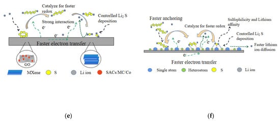 Zhenzhen Du prepared nitrogen-doped graphene (Co-N/G) by impregnation method to prepare the SACs as the host of sulfur [77]. It was found that the Co-N-C coordination center, as a dual-function electrocatalyst, can promote the formation and decomposition of Li2S in the process of discharging and charging, respectively. As a result, when sulfur loading is 6.0 mg cm−2, the area capacity is 5.1 mAh cm−2 after 100 cycles at 0.2 C and the attenuation rate per cycle is 0.029%. Because the preparation of SACs by impregnation depends on the absorption sites of the substrate, the types and yields of SACs are limited. In order to solve the above problems, Guangmin Zhou and co-workers synthesized single-atom graphene with controllable quantity, controllable load, and adjustable composition by crystal seed method (Figure 9c) [78]. Figure 9d shows that the multifunctional SACs have the advantages of strong chemical adsorption on Li2S6, promotion of conversion between sulfur/lithium polysulfide/Li2S and the ability to control deposition position of Li2S (Figure 9e), which contributes to achieving high capacity, rapid conversion, and stability. However, the use of SACs in cathodes usually requires high loading capacity of SACs in active materials, which reduces the utilization of SACs. As the separator coating can reduce the catalyst load, it is a better choice to apply SACs as separator coating in lithium sulfur battery. Linlin Zhang and co-workers prepared a type of nitrogen-doped graphene (Ni@NG) with Ni-N4 structure by pyrolysis [79]. Acts as a polysulfide trap, the oxidized Ni site in the Ni-N4 structure can catalyze reversibly the conversion of polysulfides by forming a strong Sx2− Ni-N bond (Figure 9f). In addition, on Ni@NG, the charge transfer between LPSs and nickel makes it have lower free energy and decomposition energy barrier in the electrochemical process, which accelerates the dynamic transformation of LPSs in the charge and discharge process. In this method, the lithium–sulfur battery has excellent rate performance and stable cycle life with capacity attenuation rate of 0.06% per cycle. Kun Zhang and co-workers found that Fe-SACs have better performance in lithium sulfur battery compared with three other catalysts Fe, Co, and Ni-SACs [80]. Even under the low metal loading of about 2 μg, after 750 cycles at 0.5 C, the reversible specific capacity of the cell with high sulfur loading is 891.6 mAh g−1, and the capacity retention rate is 83.7%. The single atoms with atomic size and single metal center have the largest atom utilization rate, unsaturated metal sites and unique electronic structure, which can effectively adsorb and catalyze the redox kinetic of LPSs and improve sulfur utilization rate and catalytic efficiency of the Li-S battery.