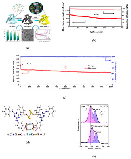 (a) Schematic illustration of the S/ZIF-8-NS-C composites preparation [14]. (b) Long-term cycling performance of cell S/ZIF-8-NS-C at 0.5 C [14]. (c) Cycling stability of S/FMNCN-900 cathode at 2 C for 1000 cycles [15]. (d) The optimum atomic model configurations showing the interactions between Cu-TDPAT and Li2S4 [22]. (e) XPS N1s spectra of Cu-TDPAT and Li2S4@Cu-TDPAT [22].