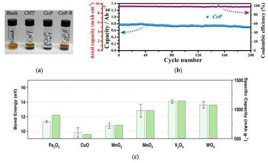 Metal compounds, such as metal oxides [23,24], nitrides [25], phosphides [26], and sulfides [27,28,29,30], have strong chemical interaction on LPSs, which have been widely used in lithium sulfur batteries. Yiren Zhong and co-workers found that CoP nanoparticles can strongly adsorb polysulfides (Figure 3a) because of their natural oxidation to form Co-O-Plike species, in which the active Co site on the surface could interact with polysulfides through strong Co–S bond [31]. As the oxide layer on the surface could strongly interact with LPSs, and the inner core is suitable for conducting electrons, the CoP nanoparticles can effectively improve the performance of lithium sulfur battery. With the high sulfur load of 7 mg cm−2, the area capacity is 5.6 mAh cm−2 after 200 cycles (Figure 3b). Fang Liu and co-workers found that there is a significant correlation between bond energy and cycle stability: the stronger bond energy between oxides and polysulfides, the higher capacity retention rate (Figure 3c) [32]. Shanshan Yao and co-workers prepared 2D-Sb2S3 nanosheet by electrochemical intercalation and stripping [33], and proved that it can effectively capture and recover polysulfide as a coupling material. In addition, as shown in Figure 3d–f, the first principle calculation confirmed that the material has appropriate bond strength of 1.33–2.14 eV, which can capture polysulfide while ensuring the stability of the internal Li-S bond, and the energy barrier of effective diffusion of Li on the surface of SSNs is low.