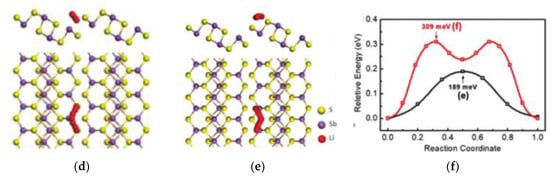 (a) Results of LPSs (5 mM Li2S6-DOL/DME solution) adsorption experiments with Carbon nanotubes (CNTs) and CoP and CoP-R nanoparticles supported on CNTs [31]. (b) Cycling performance of a high-capacity S cathode (S mass loading: 7 mg cm−2; rate: 0.2 C) modified with CoP-CNT [31]. (c) A comparison of the bond energies between the metal oxides and polysulfides (light green) with the specific capacity of the corresponding Li−S cells after 100 cycles at 1 C (green). These cells were made using RSL containing these metal oxides, respectively. The bond energies were calculated with Flore’s equation based on dissociation energy, electronegativity, and chemical hardness of metal oxides and polysulfides [32]. (d,e) Schematics of top and side views representing two Li diffusion pathways on Sb2S3 nanosheets and (f) the corresponding energy profiles for different diffusion pathways [33].