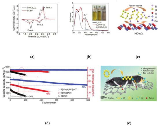Metal oxides are the first to be found to have strong chemical adsorption with LPSs, as well as strong catalytic activity for the conversion of polysulfides. Yatao Liu and co-workers used carbon-free porous hollow NiCo2O4 nanofibers as a host for sulfur to prepared the cathode [34]. As shown in Figure 4a,b, it can be found that NiCo2O4 nanofibers have strong chemisorption and catalytic ability for polysulfide conversion. The S/NiCo2O4 with sulfur loading of 1.66 g cm−3 provides the capacity of 1867 mAh cm−3, almost twice that of the traditional S/carbon composite. As shown in Figure 4c, active nickel and cobalt atoms can provide reaction sites to adsorb polysulfides and catalyze the transformation of soluble LPSs.