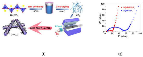 Ke Lu and co-workers found that the coupling of polar Fe3O4 with highly conductive N-doped carbon provides stronger adsorption ability for polysulfides, which is much better than that of N-doped carbon and activated carbon alone [35]. The synergistic effect of Fe3O4 and N-doped carbon makes the conversion between Li2S4 and Li2S more effective, which contributes to high capacity and long-term cycle stability in lithium sulfur battery (Figure 4d). Based on this, Meng Ding and co-workers prepared a kind of three-dimensional Fe3O4/NC/G ternary composite host for the high rate and capacity lithium sulfur batteries with liquid polyelectrolyte as the positive active material. (Figure 4e) [36]. Fe3O4 nanocrystals and a three-dimensional interconnection conductive structure are helpful to promote the reaction kinetics, accelerate electron/ion transport, alleviate the nucleation of polysulfide, and improve the rate performance. DFT calculation results clearly show that the bond energy between LPSs and carbon surface (0.10–0.52 eV) is much lower than that between LPSs and Fe3O4 (0.44–3.35 eV). Besides, the chemical adsorption between polysulfides and Fe3O4 is mainly due to the stronger polar interaction. The structure of Fe3O4 and non-polar graphene in Fe3O4/NC/G is conducive to the combination of polysulfides and the diffusion of polysulfides on the electrode. Yingze Song designed an innovative in situ synthesis method through plasma-enhanced chemical vapor deposition (PECVD), with defect graphene nanosheet directly grown on the surface of VO2 nanosheet network to obtain G-V2O3 hybrid (Figure 4f) [37]. In this method, the interface produced by PECVD technology formed a clean and efficient interface between graphene and V2O3. The Electrochemical Impedance Spectroscopy (EIS) curve showed that the composite has good conductivity and catalytic activity (Figure 4g).