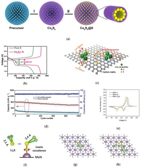 (a) Schematic illustration of the fabrication of S@Co9S8 composites [41]. (b) Discharge–charge curves of S and Co9S8+S electrodes [41]. (c) The role of CoS2 nanoparticles on polysulfides capture and conversion [42]. (d) Long-term cycling performance of Li−S batteries at 1.0 C after 1000 cycles [44]. (e) The second cycle of CV [45]. (f) Representation of the covalence-activation mechanism on MoN [46]. (g) Li ion diffusion path and (h) Li2S decomposition path on MoN. The Li, S, Mo, and N atoms are denoted by green, yellow, purple, and gray balls, respectively [46].