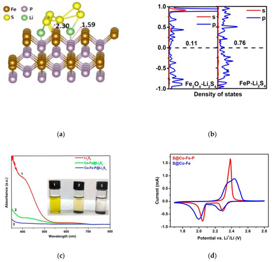 (a) Geometry of Li2S6 binding to the (111) plane of FeP [48]. (b) Density of states analysis of s bands and p bands of Li2S4 in Fe3O4(111)−Li2S4 and FeP(211)−Li2S4 systems [49]. (c) UV−Vis adsorption spectra of a Li2S6 solution before and after the addition of Co−Fe or Co−Fe−P powder. The inset shows the digital photo of Li2S6 solution before and after the addition of Co−Fe or Co−Fe−P powder [50]. (d) The second-cycle CV curves of the S@Co−Fe−P and S@Co−Fe cathodes at 0.1 mV s−1 [50].