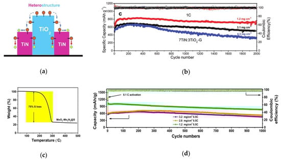 Tianhong Zhou and co-workers reported a TiO2–TiN heterostructure [54], which combines the advantages of high adsorption of TiO2 and high catalysis and conductivity of TiN to realize the capture-diffusion-conversion of polysulfides at the interface (Figure 7a). During 2000 cycles at 1 C, when the sulfur content was 3.1 and 4.3 mg cm−2, the capacity retention rate was 73% and 67%, respectively (Figure 7b). Yingze Song and co-workers found that the key to improving the electrochemical performance of lithium sulfur battery is to establish a balance between immobilization and conversion by adjusting the mass ratio of VO2 and VN [55]. Rongrong Li and co-workers proposed a kind of MoO2 and Mo3N2 heterostructure material with porous nano band morphology and low specific surface area (95 m2 g−1), which makes the conformal deposition of S/Li2S have a uniform spatial distribution [56]. TG curves show that it can achieve high S loading of 75 wt% even at low specific surface area (Figure 7c). Under high sulfur load of 3.2 mg cm−2, after 1000 cycles, the specific capacity is 451 mAh g−1 (Figure 7d). Besides, the affinity between polysulfides and the heterostructure makes it possible to obtain dendritic free Li coating on the lithium anode even after long-term cycling. Jinlin Yang and co-workers prepared a new MoO2-Mo2N binary nano-belt as separator coating material by in situ topological nitriding method (Figure 7e) [57], which not only acts as a physical barrier to reduce the shuttle effect, but also combines the polarity of MoO2 and the conductivity of Mo2N, regulating the conversion of polysulfide and optimizing the nucleation of solid Li2S during the cycling process (Figure 7f).