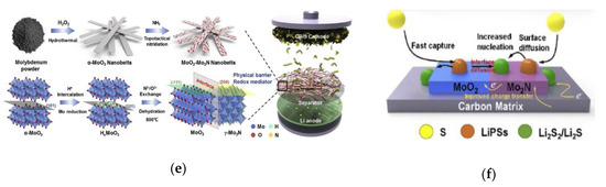 - Li, R.; Zhou, X.; Shen, H.; Yang, M.; Li, C. Conductive Holey MoO2-Mo3N2 Heterojunctions as Job-Synergistic Cathode Host with Low Surface Area for High-Loading Li-S Batteries. ACS Nano 2019, 13, 10049–10061. [Google Scholar] [CrossRef]