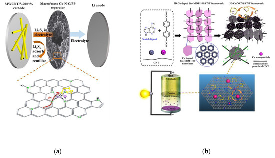 - Hu, W.; Hirota, Y.; Zhu, Y.; Yoshida, N.; Miyamoto, M.; Zheng, T.; Nishiyama, N. Separator Decoration with Cobalt/Nitrogen Codoped Carbon for Highly Efficient Polysulfide Confinement in Lithium–Sulfur Batteries. ChemSusChem 2017, 10, 3557–3564. [Google Scholar] [CrossRef] [PubMed]