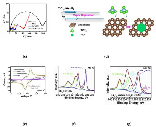 (a) Schematic configuration of the assembled Li-S cell model and the electrochemical improvement mechanism of the macro/meso Co-N-C-decorated separator [62]. (b) The scheme of rational design of 3D Co/NCNS/CNT as separator coatings for high-performance Li-S battery [63]. (c) The EIS spectra of different materials in a symmetric cell with Li2S6 in the electrolyte [63]. (d) Schematic illustration for the synthesizing TiC nanosheets directly inlaid into the plane of graphene templates using TiCl4 as the reactant [67]. (e) The polarization curves of the symmetrical cells with and without Li2S6 recorded from −1.0 to 1 V at 10 mVs−1 [68]. (f) Mo 3d spectra of the Mo2C–C NOs [68]. (g) Mo 3d spectra of Li2S6 soaked Mo2C–CNOs [68].