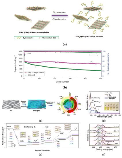 An insurmountable obstacle for MXene nanowafers is the large numbers of hydrogen bonds produced by the surface functional groups. MXene nanowafers have a strong tendency of reaggregation, which results in a large amount of loss of active regions. As a result, the long-term cycling and magnification performance of MXene/S anode are poor. Therefore, before sulfur loading, mesoporous carbon, r-GO, and CNT are coated or two-dimensional nanosheets are integrated into three-dimensional structure to prevent MXene nanosheets from aggregating [74]. Xiaotian Gao first reported the growth of TiO2 quantum dots (QDs) on ultra-thin MXene (Ti3C2Tx) nanosheet by cetyltrimethyl ammonium bromide-assisted solvothermal synthesis (Figure 9a) [75]. TiO2 QDs are uniformly modified on MXene nanosheets in order to act as a spacer to prevent them from reassembling, thus maintaining the stability of its two-dimensional geometry. In this way, the adsorption capacity of polysulfides enhances and the dynamics of redox accelerates. At 2 C, the high capacity of 680 mAh g−1 was maintained after 500 cycles and the attenuation rate per cycle was only 0.04% (Figure 9b).
