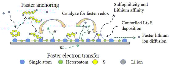 As the catalytic performance is related to the particle size, it is assumed that the maximum catalytic efficiency can be achieved with single atom. In fact, single-atom catalysts (SACs) have the advantages of both heterogeneous and homogeneous catalysts, and their theoretical atom utilization rate reaches up to 100% because of high conductivity. Therefore, it has been used to improve the electrochemical performance of lithium–sulfur battery, and the results show that its catalytic performance is far better than that of traditional metal nanoparticles. However, due to the high surface free energy of the single metal center, single-atom catalysts are chemically unstable and even tend to aggregate into metal nanoparticle, which reduces the catalytic activity and slows down the conversion of lithium polysulfide in electrochemical process. Therefore, in order to stabilize the single-atom catalyst and further improve its catalytic performance, nitrogen-doped graphene with large specific surface area and high conductivity is selected as an ideal substrate material, because the nitrogen group on graphene can interact with transition metal through M-N structure to improve the catalytic activity of monoatomic catalyst in electrochemical process [76].