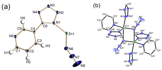(a) Thermal ellipsoid plots of the asymmetric unit of compound with the 50% probability level, whereas hydrogen atoms are drawn as spheres of arbitrary radii. (b) Thermal ellipsoid plot of symmetrical molecular arrangement. Hydrogen is omitted for clarity [41].