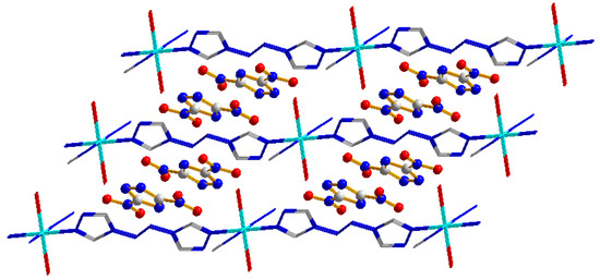 Cationic EMOFs are when metal ions coordinate directly with nitrogen atoms with lone pair electrons in the energetic ligands, so the main skeleton has a cationic charge. At this time, there will be corresponding anions in the structure channel to balance the charge of the main skeleton. Common inorganic anions would be NO3− and ClO4− [49]. Due to the low heat of formation, the inorganic anion shaves little significance to improve the energy performance of EMOFs materials. Meanwhile, ClO4− anions would transform into environmentally harmful chlorides (such as HCl) when the materials are burned or exploded. Therefore, the energetic anion used to replace the inorganic anion to balance the charge of the skeleton would be a research focus. For example, the research team of Beijing institute of technology of China has developed ten kinds of EMOF materials containing polynitroazole ring anions [38], such as 2D {Cu(atrz)2(C2N5O4)22H2O}n (MOFs(DNT)), {Cu(atrz)2(C3N5O6)22H2O}n (MOF(TNP)), {Cu(atrz)2(CN5O2)22H2O}n (MOF(NTT)), etc. Among them, 3,5-dinitro-1,2, 4-triazole anions (C2N5O4), 3,4,5-trinitropyrazole anions (C3N5O6) and 5-nitrotetrazole anions (CN5O2) lie in the 2D planar skeleton. For example, the schematic diagram of the layered structure of MOFs (DNT) is given in Figure 4. In addition, nitrogen and oxygen bonds are introduced into the nitrozole rings, to synthesize the corresponding EMOF materials, such as 2D EMOFs(DNTO) and EMOFs(TNPO) and 3D EMOFs(NTTO). Due to the introduction of the N-O bond, the structure density would increase, so the material density and oxygen balance could be improved, and the energy level could be further improved.
