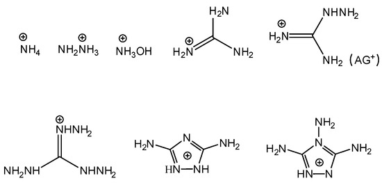 - Singh, R.P.; Verma, R.D.; Meshri, D.T.; Shreeve, J. Energetic nitrogen-rich salts and ionic liquids. Ang. Chem. Int. Ed. 2006, 45, 3584–3601. [Google Scholar] [CrossRef]