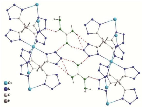 In 2016, the research group of Beijing institute of technology reported that two cases of anionic EMOF materials with bitetrazomethane (BTM) as ligand and AG+ as template were successfully synthesized: [(AG)3(Co(BTM)3)] and {[AG]2(Cu(BTM)2)]}n [49].The asymmetric unit of {[AG]2(Cu(btm)2)]}n consists of one divalent Cu(II) ion, two BTM dianions and two aminoguanidinium cations. In the structure (Figure 6), each copper ion coordinates with six nitrogen atoms from four BTM, and BTM has a three-coordination mode. The copper ions and the BTM ligands form a two-dimensional layered structure with infinite extension, and AG+lies between adjacent layers, leading to a large number of hydrogen bonds, by which the 2D coordination polymer finally forms a 3D network. The performance characteristics of two EMOF materials are given as follows: [(AG)3(Co(btm)3)](N% = 68.7%, ρ = 1.684 g·cm−3, Td = 268.1 °C, D = 10.21 km·s−1, P = 44.45 GPa) and {[AG]2(Cu(btm)2)]}n (N% = 65.41%, ρ = 1.826 g·cm−3, Td = 212.5 °C, D = 10.97 km··s−1, P = 53.92 GPa).