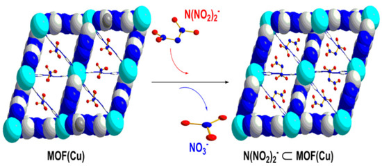 In 2016 [80], a novel HEMOFs material of {[Cu(atrz)3[N(NO2)2]2}n [N(NO2)2−⊂MOF(Cu)] was reported to develop based on the feature of multiple channel of [Cu(atrz)3(NO3)2]n [EMOF(Cu)]. In the 3D structure of this material, the metastable dinitramide anion [N(NO2)2−] is encapsulated within the molecule channel through ion exchange (Figure 8), which prevents[N(NO2)2−] from water molecules. The resultant inclusion complex exhibits greatly improved energy and remarkable thermal stability (Td of 221 °C, D of 6824 kJ·kg−1, IS of 9J, ES of 2.21J). Due to the introduction of metastable groups, the safety of this material is slightly lower than that of HEMOF (Cu), but still better than that of CL-20.