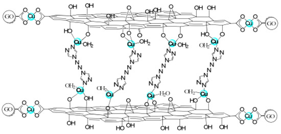 Many researchers have found that graphene oxide (GO) can stabilize HMX and other high EMs viaa simple method and can be used as an excellent candidate for further chemical functionalization. The metal ions can also be bound to GO sheets, forming crosslinked structures with greatlyimproved mechanical strength, as well as many other functional nanomaterials, with promising electronic properties [82]. Recently, four types of nano GO-Cu(II)-ECPs (Gozin et al., Israel) were produced based on graphene oxide (GO)-copper(II) complex, by using 5,5’-azo-1,2,3,4-tetrazole (TEZ) and 4,4’-azo-1,2,4-triazole (atrz) as linking ligands between GO-Cu layers [83]. Depending on the reaction conditions, hermostable and insensitive ECPs or hybrid ECPs could be formed. In the preparation process, GO first reacted with Cu(NO3)2 to gain GO-Cu layers (carriers) through the hydrothermal method. Then, energy ligands of ATRZ coordinated with copper ions of carrier, introducing atrz between GO-Cu layers (Figure 9). In this series of materials, Hybrid ECP-1 has a density of 2.85 g·cm−3, a detonation velocity of 7082 m·s−1, an impact sensitivity greater than 98J and a friction sensitivity greater than 360N.