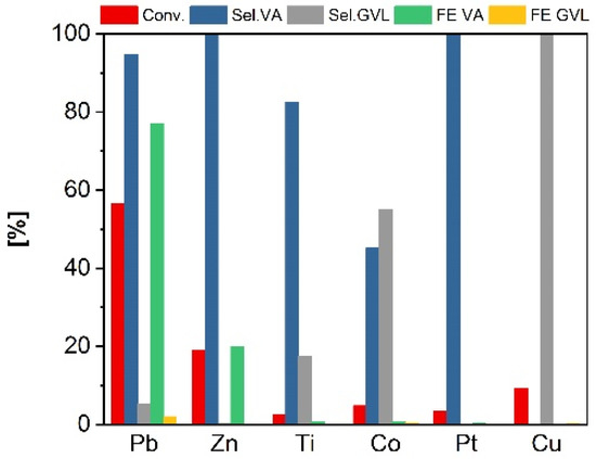 Conversion of levulinic acid (LA), selectivity to products, and Faradaic efficiency (FE) for the electrocatalytic hydrogenation (ECH) of LA to valeric acid (VA) and γ-valerolactone (GVL) at various types of metallic electrodes. Conditions: 0.2 M LA, 0.2 M H2SO4 electrolyte, −1.8 V vs. Ag/AgCl, 2 h.