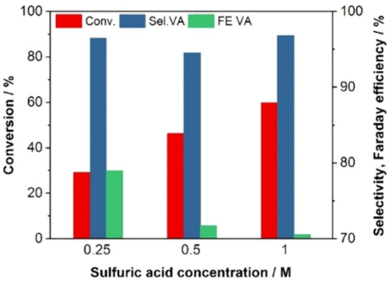 Conversion of LA, selectivity to VA, and FE of VA at different sulfuric acid concentrations as the electrolyte. Conditions: Pb cathode, 0.2 M LA, −1.8 V vs. Ag/AgCl, and 1 h.