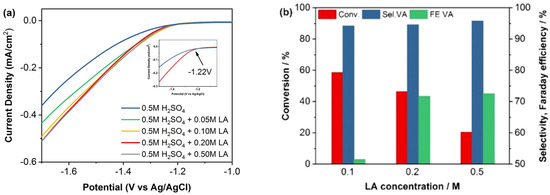 The concentration of hydrion is of vital importance in the ECH of LA. Figure 4 presents the effect of concentrations of the sulfuric acid electrolyte at the potential of −1.8 V for 1 h. The conversion of LA obviously improves with decreasing pH of the solution. When the concentration of sulfuric acid changes from 0.25 M to 1.0 M, the conversion of LA has almost doubled, which is attributed to the enhancement of electrolytic ability of water and the boost of hydrion generation. However, the FE of VA decreases slightly at lower pH. In essence, taking acid electrolyte as an example, the Volmer step (Equation (1)), in which H+ gets electrons on the cathode surface to form the adsorbed hydrogen (Hads), provides subsequent ECH steps with Hads as the hydrogen source. However, this Hads also participates in the Tafel (Equation (2)) and Heyrovsky (Equation (3)) steps.