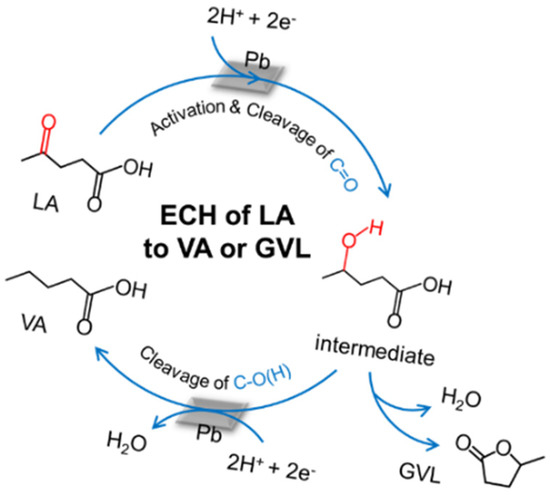 As can be shown from the above, the entire process of ECH is more environmental-friendly, has great research value and application prospects, and is becoming the focus of current research [12,17,18,19,20]. However, due to the competition of water splitting to generate H2, the ECH of biomass conversion in aqueous solution always results in low conversion and Faradaic efficiency (FE), which means that the electron transfer is not fully used for hydrogenation of substrates but for producing H2 and other byproducts. In general, the hydrogen evolution reaction (HER) mainly competes with ECH, and it is thus necessary to find a way to suppress HER or achieve high conversion and good selectivity. When it comes to the ECH of LA, Schröder first proposed a two-step electrochemical conversion of LA to octane via VA over Pb and Pt electrodes, and clarified the application of electrochemistry in the production of renewable chemicals and biofuels [21]. Subsequently, it was found that the composition of the electrolyte, the reactant concentration, and the nature of the electrode material had a strong influence on the selectivity of product formation [22]. Xin et al. conducted the ECH of LA in a single-poly-mer electrolyte membrane electrocatalytic (flow) cell reactor and found that the conversion of LA at −1.5 V vs. reversible hydrogen electrode (RHE) could reach 96.8% over a Pb electrode for 10 h through a four-electron transfer [23]. Furthermore, the addition of formic acid could increase the conversion of LA to some extent [24]. Recently, Wu reported that GVL was the only product and the FE could reach 78.6% in the ECH of LA when using PbS with different degrees of oxidation as a catalyst and 1-butyl-3-methylimidazolium tetrafluoroborate as the electrolyte [25]. However, some reaction parameters that are all important aspects of the direct conversion of LA to VA over the ECH process have not been investigated in depth. The reaction mechanism and the stability of electrodes in the acid environment also need to be examined.